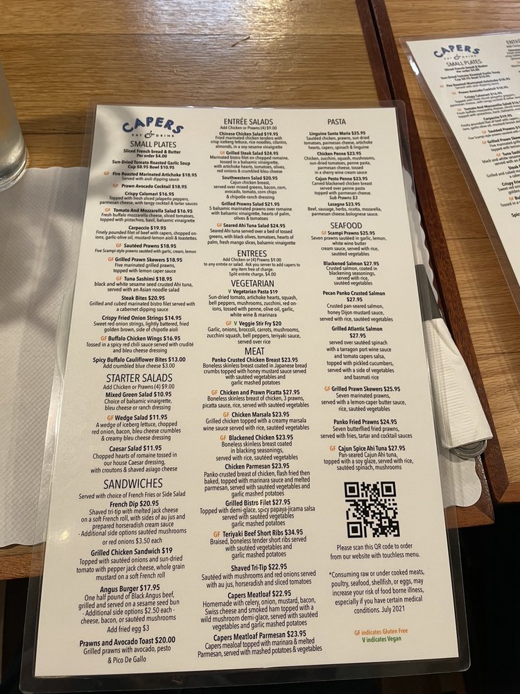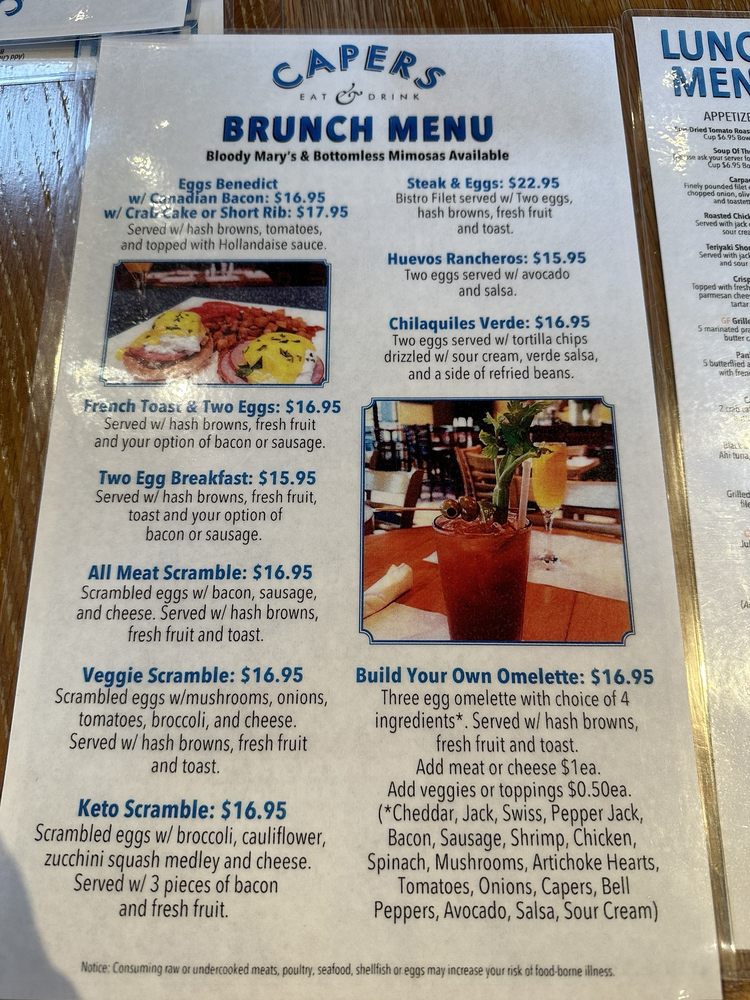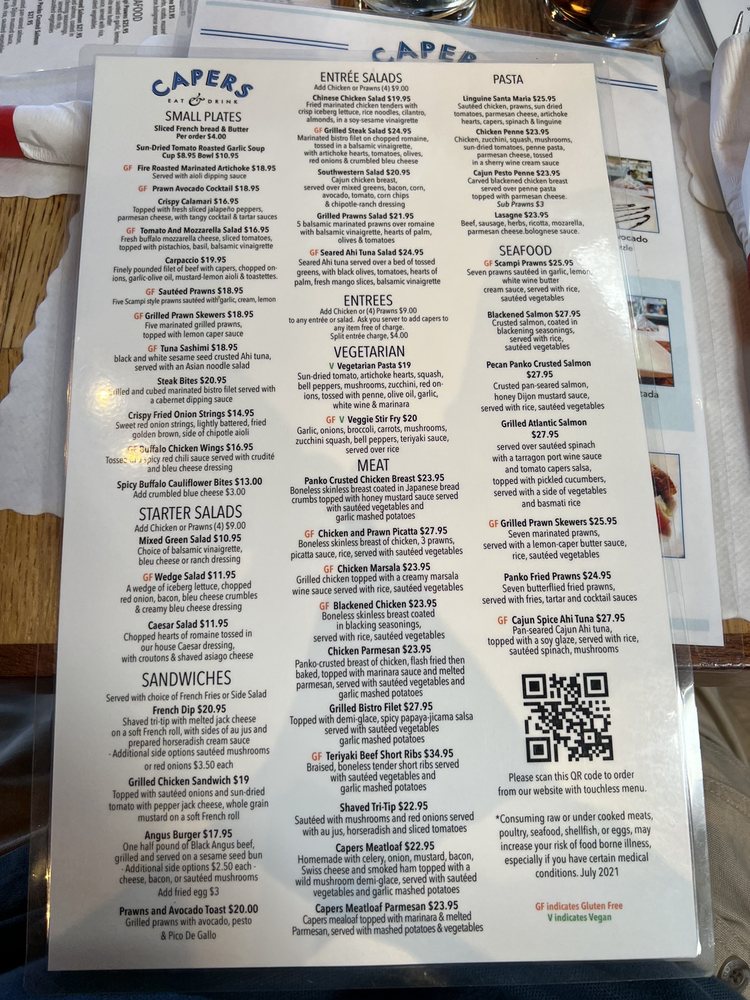 Welcome to Capers Eat & Drink, where a modern twist on New American cuisine awaits you. Nestled in a cozy shopping plaza in Campbell, CA, this lively eatery combines quality food with an eclectic atmosphere. Capers offers a diverse menu featuring fresh seafood like the Blackened Salmon and Cajun Spice Ahi Tuna, alongside hearty brunch options like Eggplant Parmesan and Fettucini Primavera.